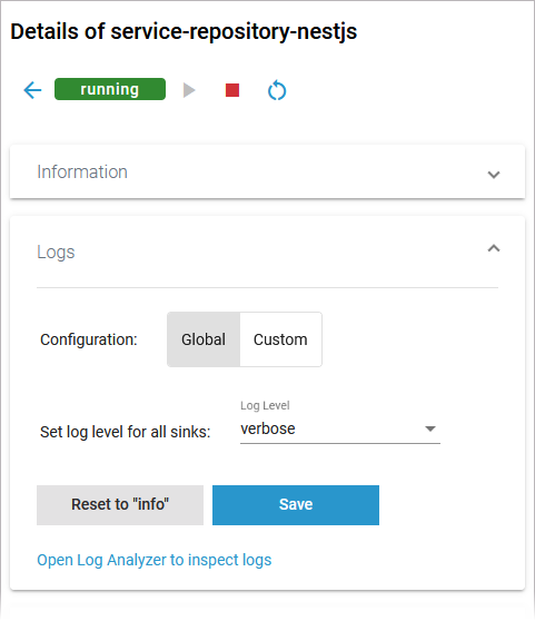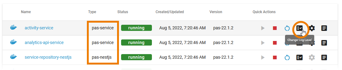 In the administration application you have the possibility to change the log level for a Docker container. The functionality is currently available for the following service types: