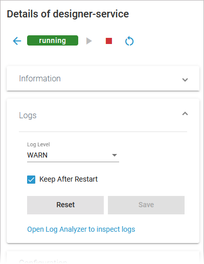 The chosen log level is kept after a restart of the service. If after a restart of the service you want to return to the previously used log level, disable option Keep after Restart: