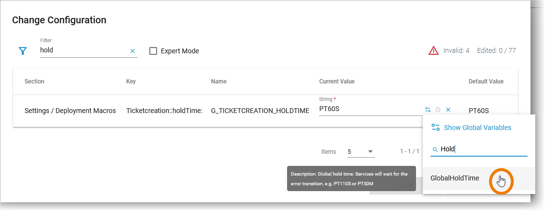 A menu opens in which all available global variables are displayed that are of the same type as the current value that you want to change. Hover over a global variable to display its description in a tooltip. Use option Show Global Variables to open the global variables view. It shows all available global variables and their details. You can also create new global variables here (refer to Managing Global Variables for Containerized xUML Services for more information):