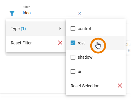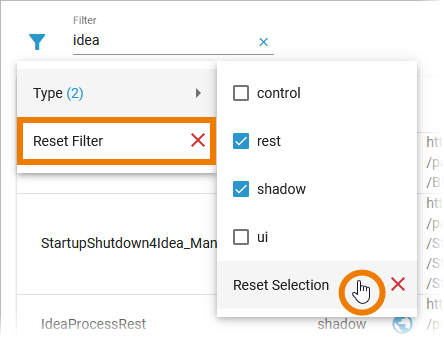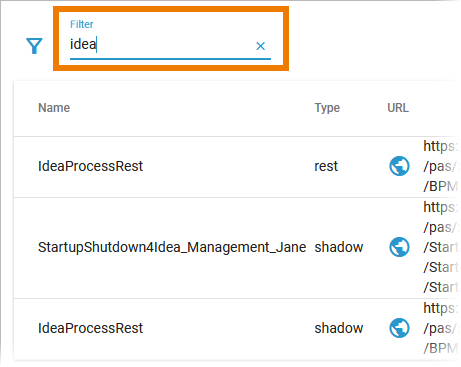 Use the filter field to search for a specific endpoint. The content of the filter field is applied to the columns Name and Type: