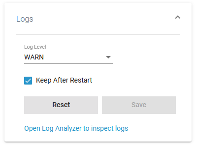 The link in section Logs gives you direct access to the Log Analyzer, where you can inspect the logs. Refer to Showing Docker Container Logs and Analyzing Platform Logs for further information.