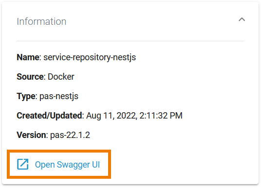 For services of type pas-nestjs, the information section also contains a link to the Swagger UI: