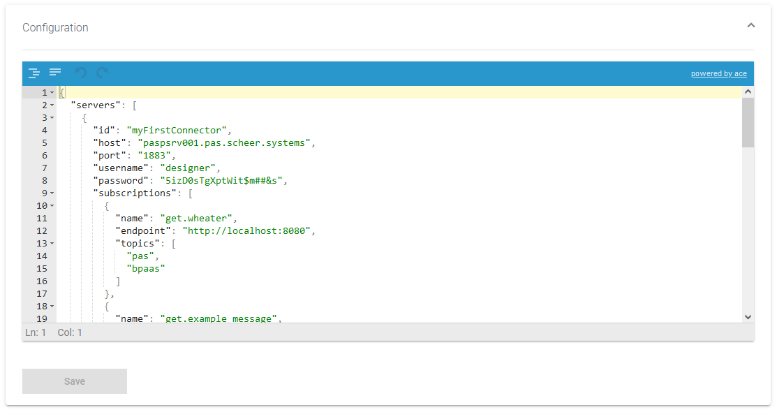 If no schema is available, a JSON editor is displayed in section Configuration:
