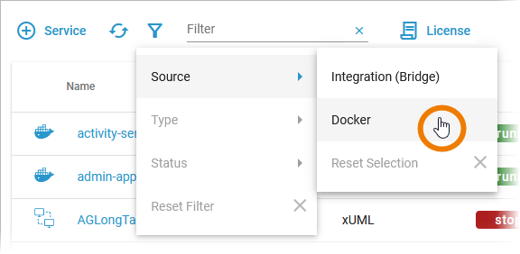 All available services are displayed in the list on the administration start page. If you want to monitor only Docker containers, filter for Source Docker: