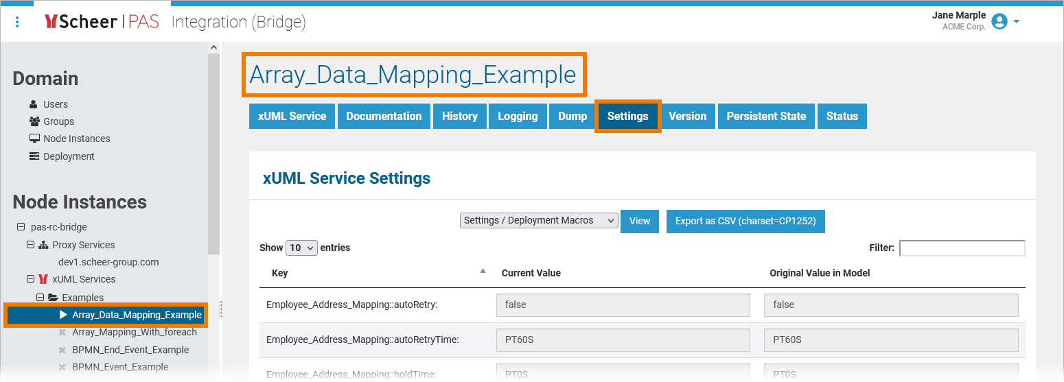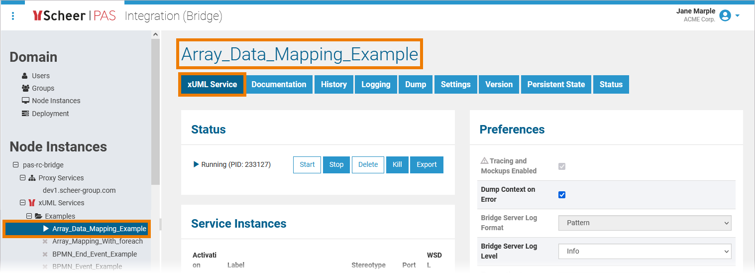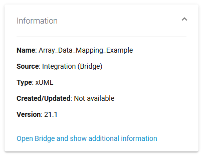 If you click the link, the service opens directly in the Integration (Bridge) and the main tab of the service displayed. The service in our example is an xUML service, so the open tab is XUML Service: