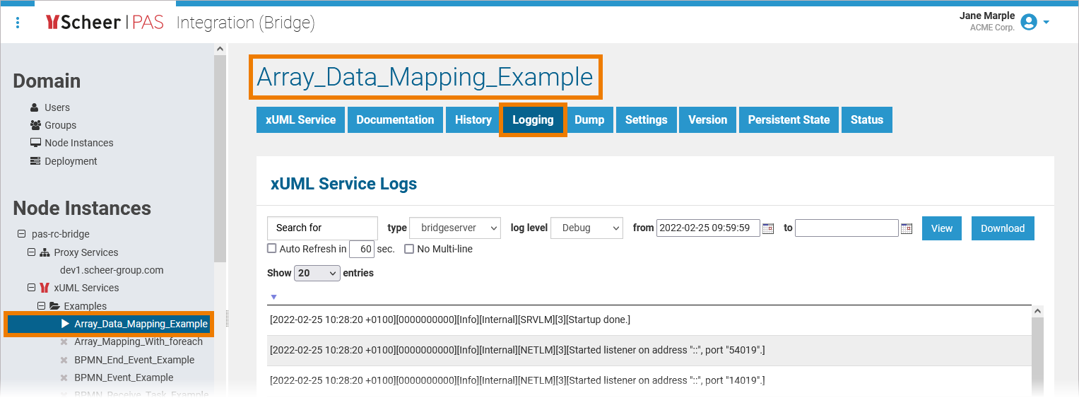 If you click the link, the service opens directly in the integration component (Bridge) of the platform and tab Logging is displayed: