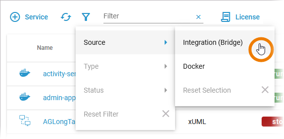 All available services are displayed in the list on the administration start page. If you want to monitor Integration services only, filter for Source Integration (Bridge):