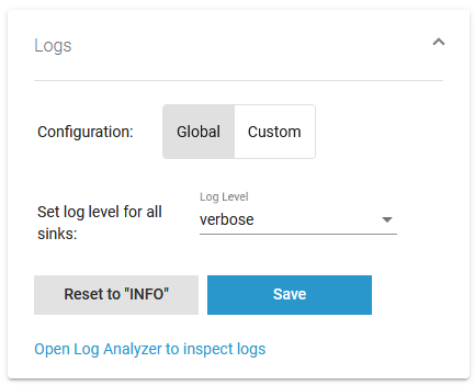In section Logs you can change the log level. Refer to Changing the Log Level of a Workload for detailed information. The link in section Logs gives you direct access to the Log Analyzer, where you can inspect the logs. Refer to Showing Workload Logs and Analyzing Platform Logs for further information.