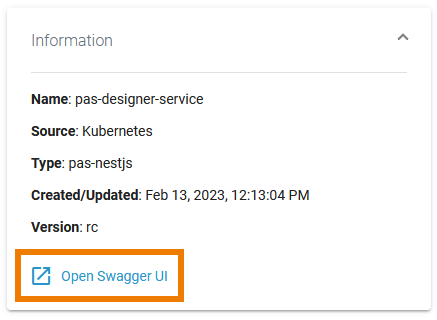 For services of type pas-nestjs, the information section also contains a link to the Swagger UI: