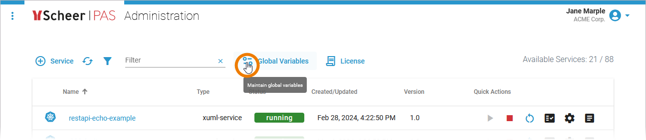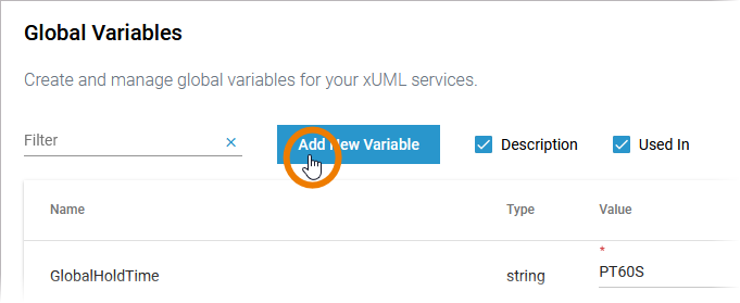 Administrators can manage the settings of an xUML service in section Configuration in the service details view. With PAS 24.0 it is also possible to define global variables. This allows to use the same setting value in various - or all - xUML services of your PAS installation.