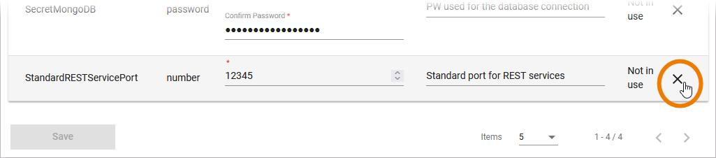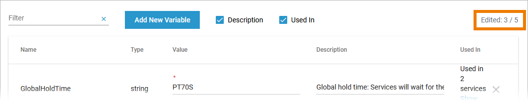 You can adjust value and description of a created global variable at any time. Edit the content directly in the global variables' list. Save is only enabled when changes have been made: