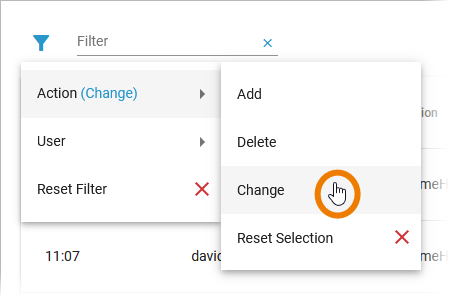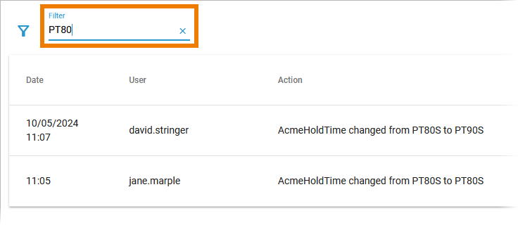 The global variables history log is a read-only view that supports users to keep track of all changes that have been made to the global variables. Use the filter field to search for a global variable change. The content of the filter field is applied to column Action: