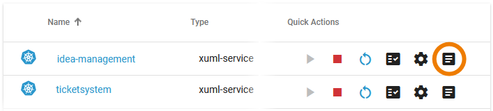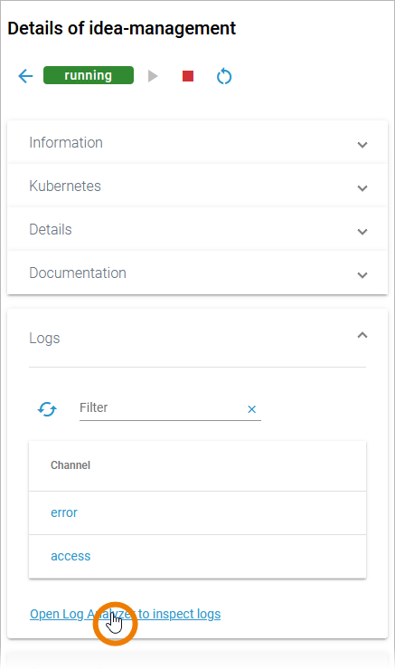 Both ways will open the logs of the corresponding Kubernetes workload in the Log Analyzer where you can view, filter and search the platform logs for all services: