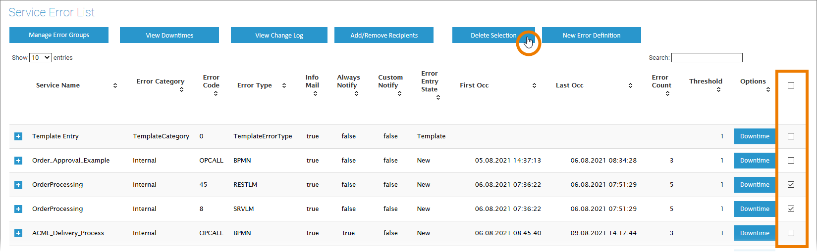 In the far right column of the error list you can select entries by a checkbox. Clicking the Delete Selection button will delete all selected entries: