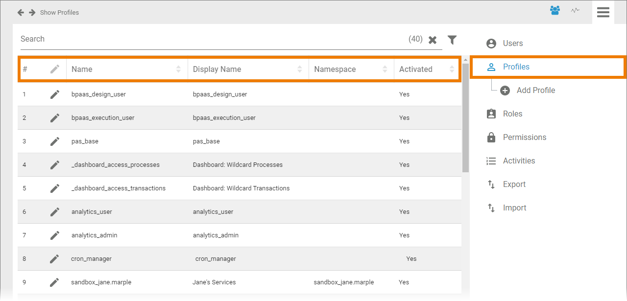 Profiles without Namespace are used exclusively to manage required access rights for the different platform components.