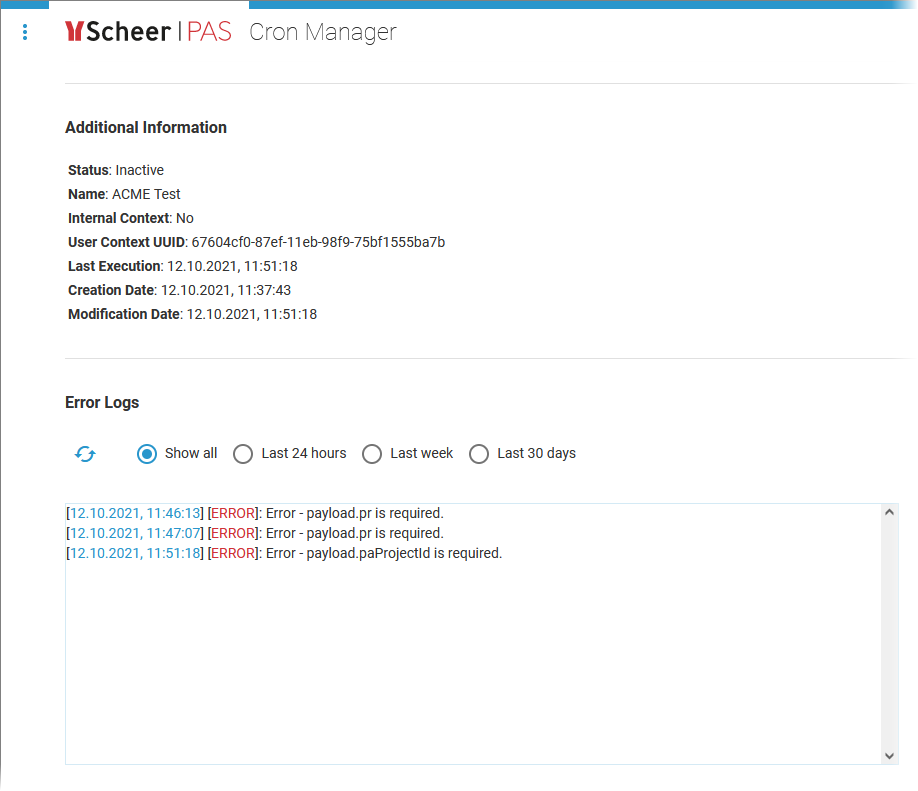 The maximum size of the error log for each cron job is per default 100. You can adjust the value in the service-specific configuration file, refer to Adapting Integration Service Configuration for further information. In the configuration file, adjust the property errorLogMaxSize and restart the cron-service.
