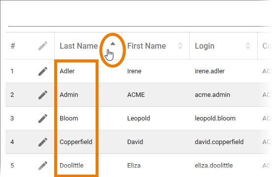 You can sort the content of each list in the content area. Therefore, just click the arrow icons of the column you want to sort the list by: