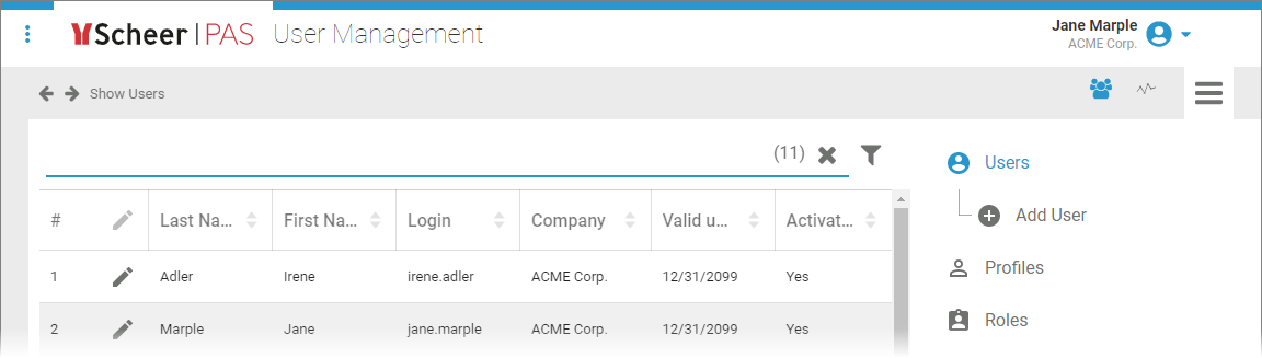 This chapter explains how to manage your Scheer PAS users within the User Management. Only users with profile user_management_admin are able to use the user management.