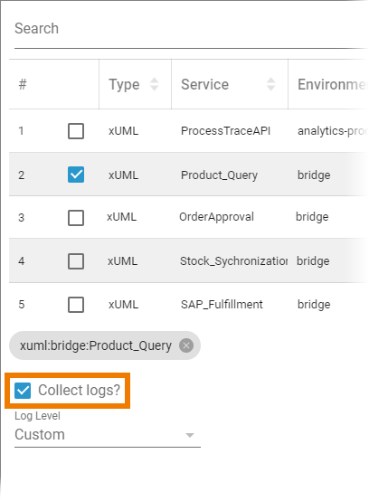 To collect the logs of the selected service, activate the checkbox Collect logs? Then choose the desired Log Level from the drop-down list. The following options are available: