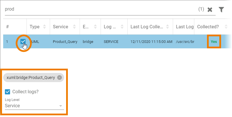 The entry in column Collected? indicates whether the service logs are collected or not. If the logs are collected, the entry is Yes. To deactivate the collection of logs for an active service, select the checkbox in front of the service's name. The selected service is shown below the list and the option Collect logs? is displayed: