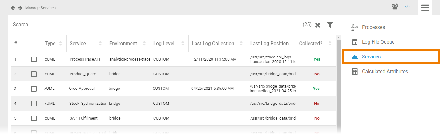 The list of services enables administrators to monitor the used services. It also allows them to manage the collection of logs.