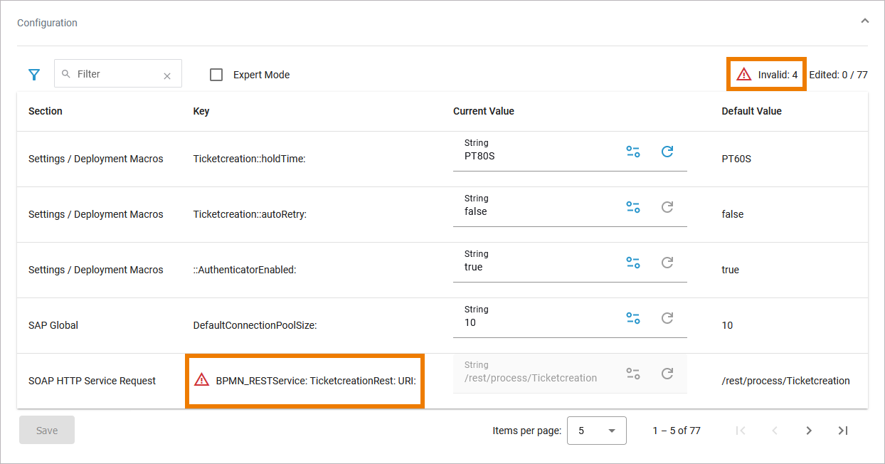 Service settings can be erroneous if a setting name contains special characters or whitespaces. Invalid service settings are marked with a red flag. Their number is also displayed on top right of the list. If a service setting is erroneous, you cannot change its current value.