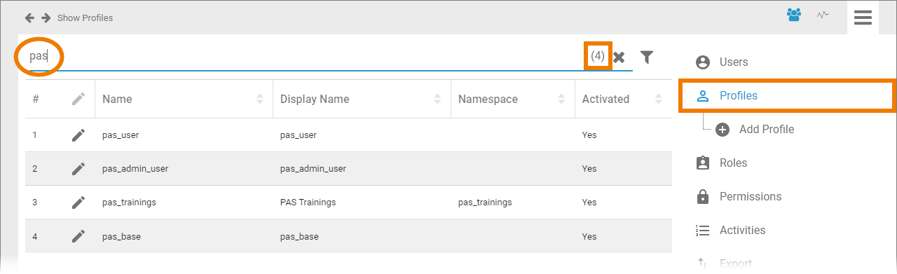 Select Profiles in the sidebar menu to display the list of all profiles. On the right side of the filter bar, the total number of profiles is displayed. If a filter is set, the number of filter results is shown here: