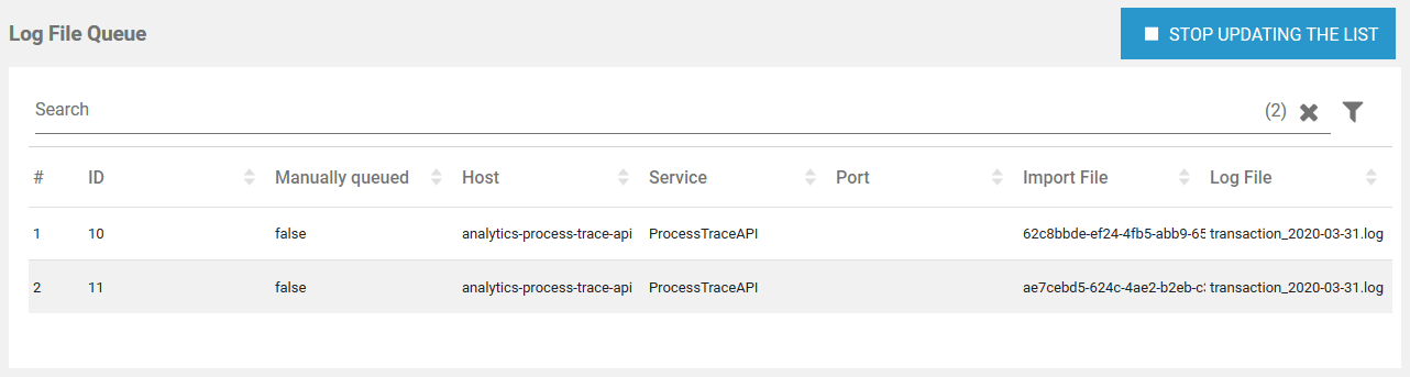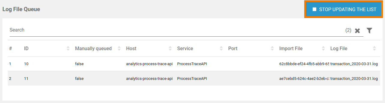 As a result, the list in the Log File Queue section can change very quickly, which makes it difficult to filter the list. The Stop Updating the List button is available to enable administrators to filter the list in a meaningful way: