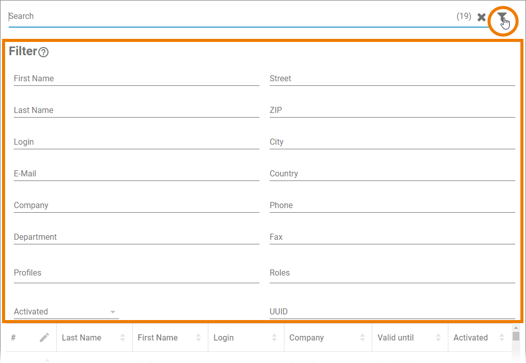 The content of a selected menu item is listed in the content area of the user management . The corresponding list shows the existing data. If you scroll down the list, its content is loading dynamically. Use the filter in the header to filter the entries: