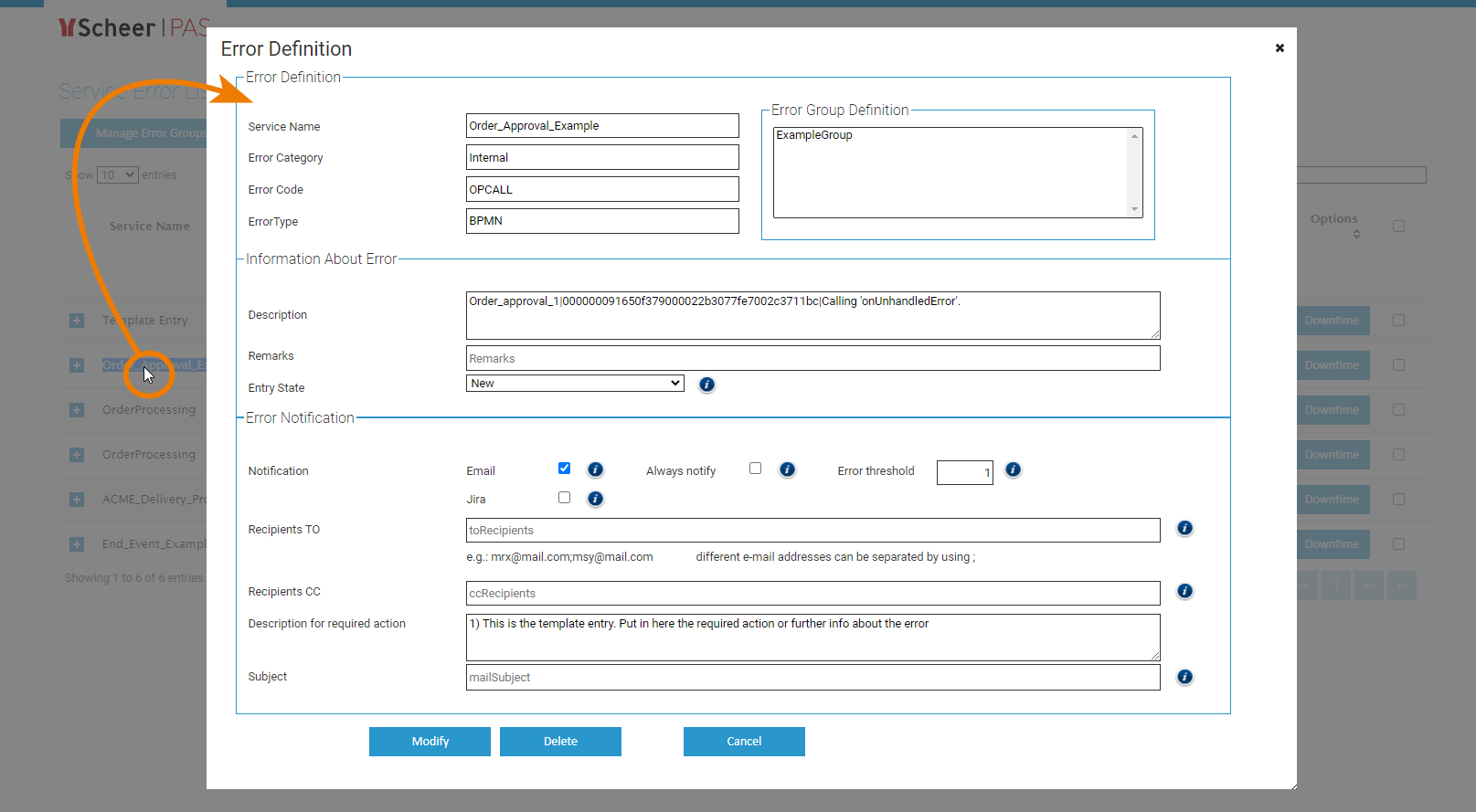 Once the entry is created, it can be modified to configure individual handling for this specific type of error. To open the configuration dialog, double click the entry in the list: