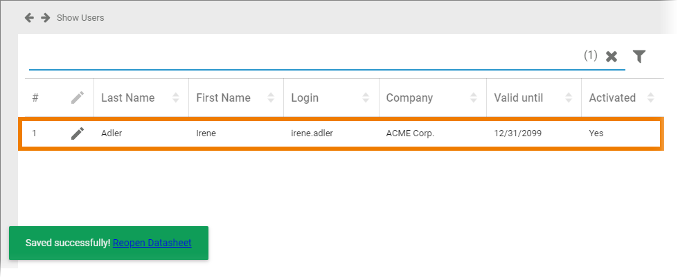 The data sheet closes and the new user is displayed in the user list. You can use the link in the success message to reopen the user data sheet, for example to edit the user data or to check whether the sandbox has been created and assigned: