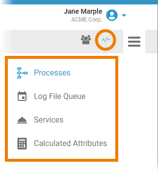 Use the navigation bar to switch between the user management and the Process Mining view, to show and hide the sidebar menu and to navigate through the Process Mining administration pages. See Features of the Navigation Bar for detailed information.