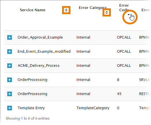 The first four columns of the error list contain the meta information about the error, e.g. which specific service, identified by its name, is affected. Entries can either be one of the uncaught errors thrown by the xUML Runtime or a user generated log entry by using the log operation and type Error.