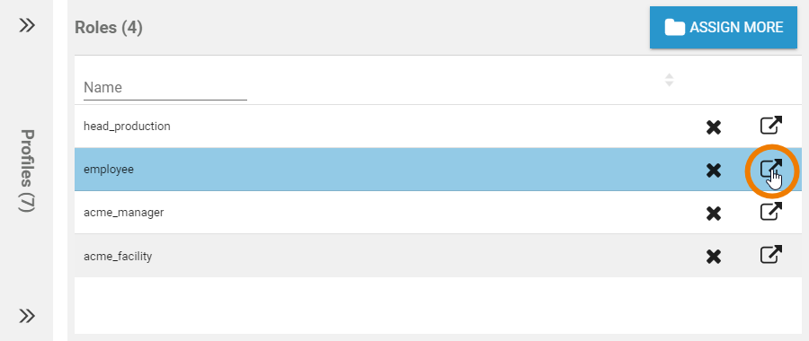 You can manage profiles and roles in the second section of the user data sheet. Use the section's sidebar to switch between the profiles and the roles view: