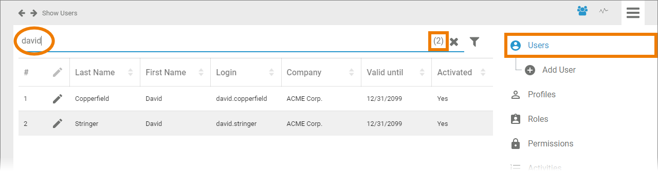 If you want to edit a user data sheet, open it first. Select Users in the sidebar menu to display the list of all users. On the right side of the filter bar, the total number of users is displayed. If a filter is set, the number of filter results is shown here: