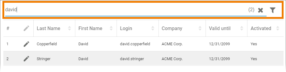 The content of a selected menu item is listed in the content area of the user management . The corresponding list shows the existing data. If you scroll down the list, its content is loading dynamically. Use the filter in the header to filter the entries: