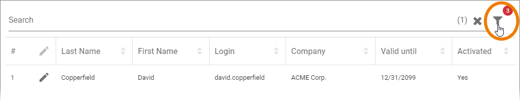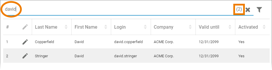 For a full-text search, enter your search criteria in field Search. The list shows all entries matching the search criteria. On the right side of the filter, you find the total number of matches in parentheses: