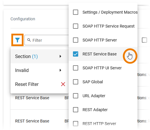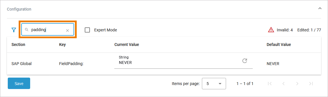 As there are many available settings, use the filter field to search for the setting you want to modify. The content of the filter field is applied to the columns Section and Key: