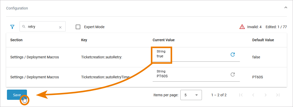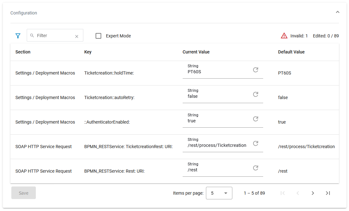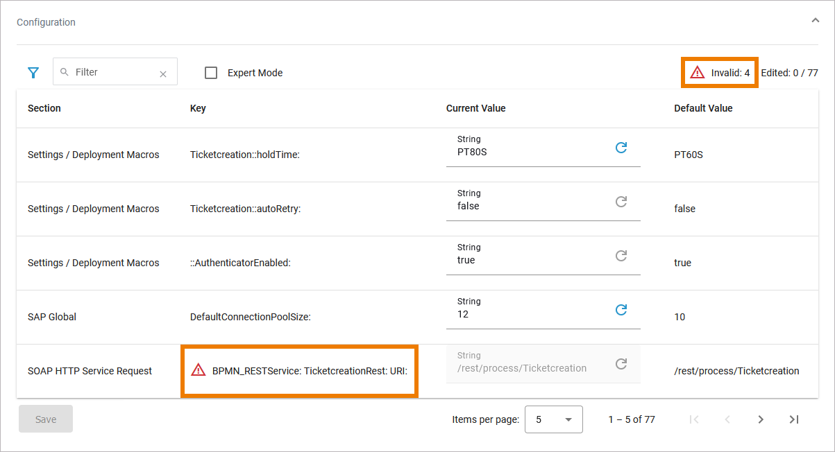 Service settings can be erroneous if a setting name contains special characters or whitespaces. Invalid service settings are marked with a red flag. Their number is also displayed on top right of the list. If a service setting is erroneous, you cannot change its current value.