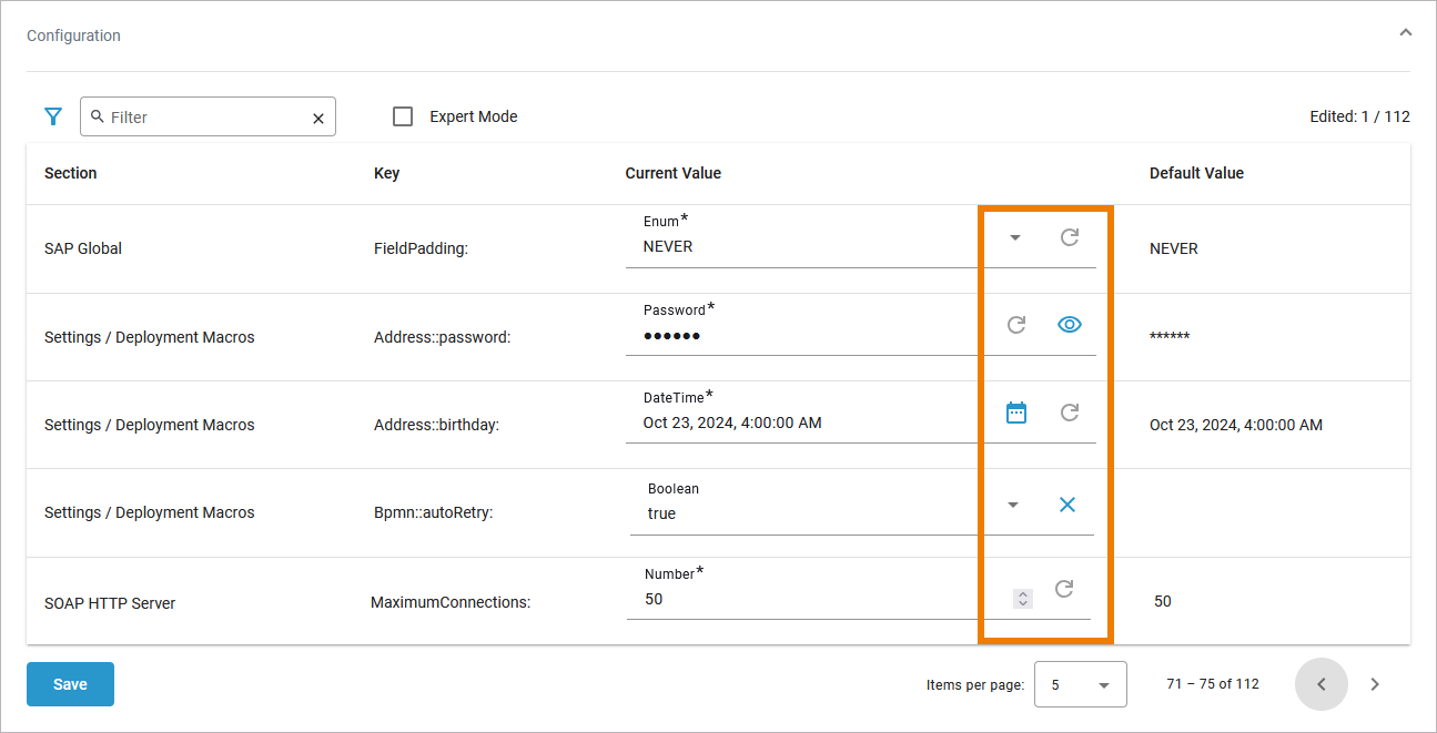 You can change the Current Value of a service setting: Just overwrite the displayed value. Each input field also offers some additional options: