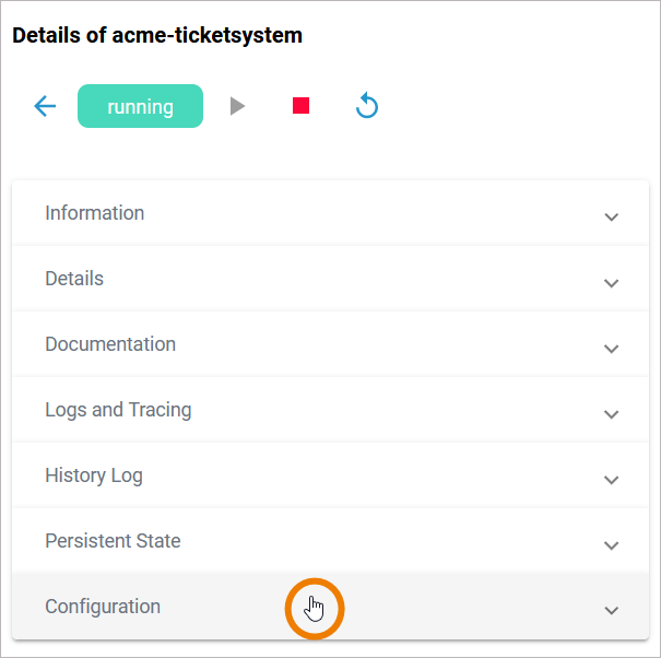 In the Configuration section you can directly modify xUML service settings. When you save your changes, the container will be re-created and restarted. Changes are possible after the first deployment of the containerized service: