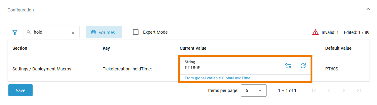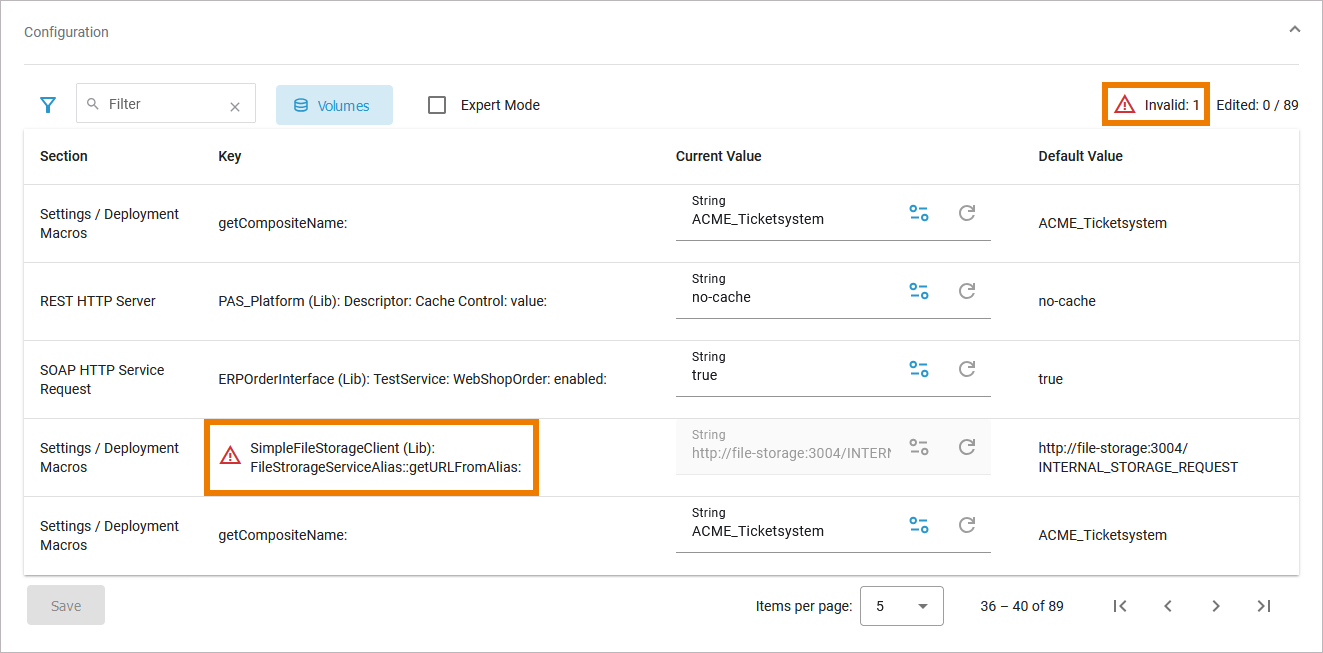 Service settings can be erroneous if a setting name contains special characters or whitespaces. Invalid service settings are marked with a red flag. Their number is also displayed on top right of the list. If a service setting is erroneous, you cannot change its current value.