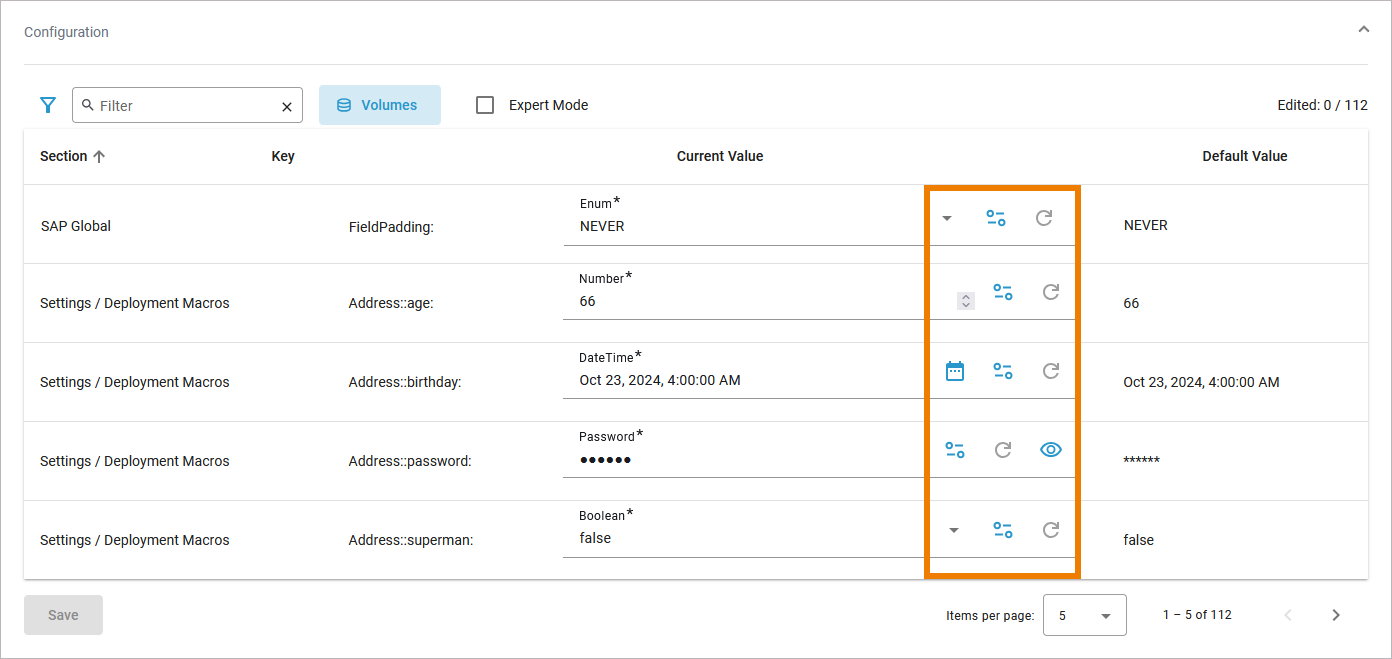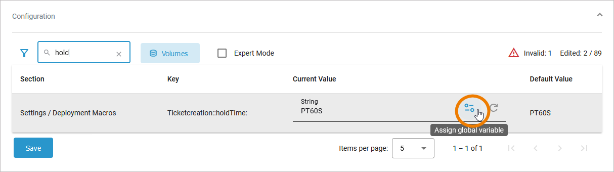 As there are many available settings, use the filter field to search for the setting you want to modify. The content of the filter field is applied to the columns Section and Key: