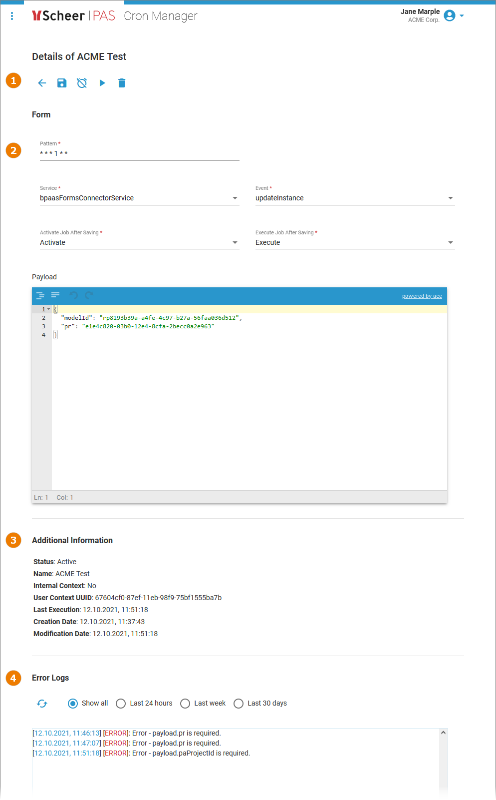 ![]() | Section Error Logs allows the user to search the logs of the cron job. Refer to Reading the Logs of a Cron Job for further details. The maximum size of the error log for each cron job is per default 100. You can adjust the value in the service-specific configuration file, refer to Adapting Integration Service Configuration for further information. In the configuration file, adjust the property errorLogMaxSize and restart the cron-service. Please note that old logs will be deleted if you decrease the value (sorted by their creation date). Changing the value affects all cron jobs. |