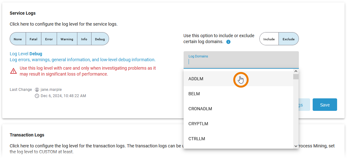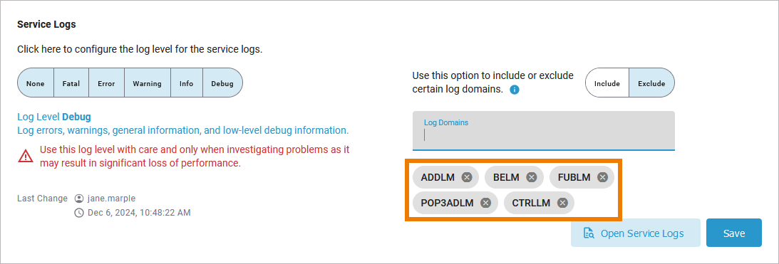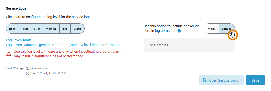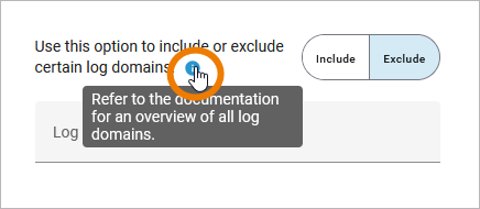 If you select the highest log level Debug, you have an additional option: You can include or exclude specific log domains (refer to Log Errors in the Designer Guide for an overview on all error domains). First select if you want to Include or Exclude the log domains: