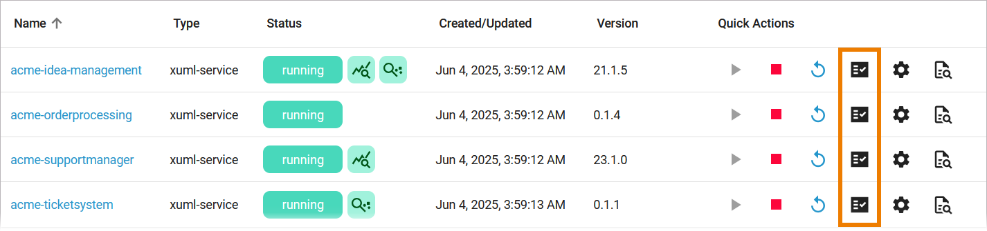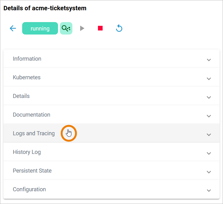 Click Open Service Logs to inspect the service logs directly in the Log Analyzer, refer to Showing Logs of a Containerized xUML Service (Kubernetes) and Analyzing Logs for further information: