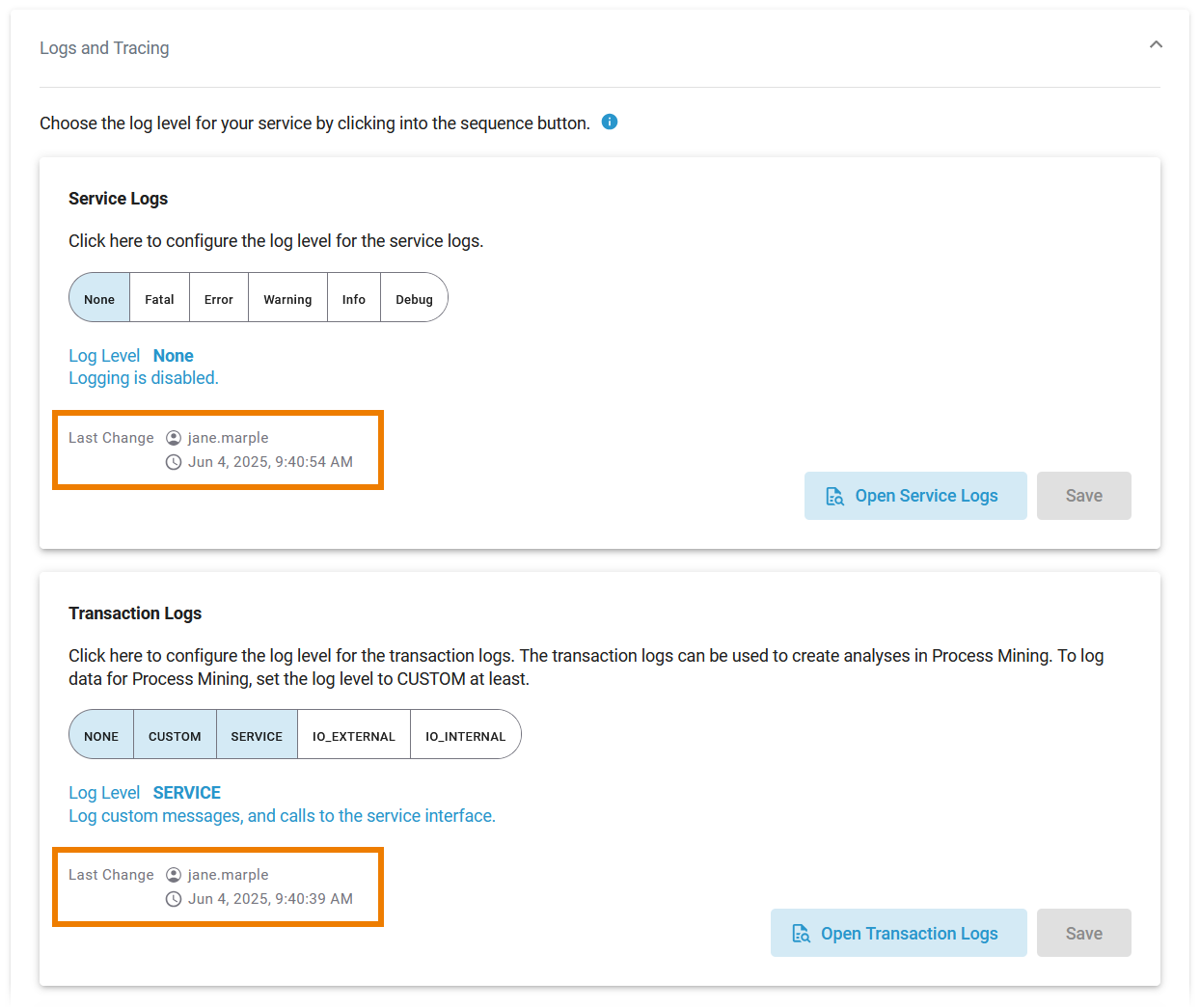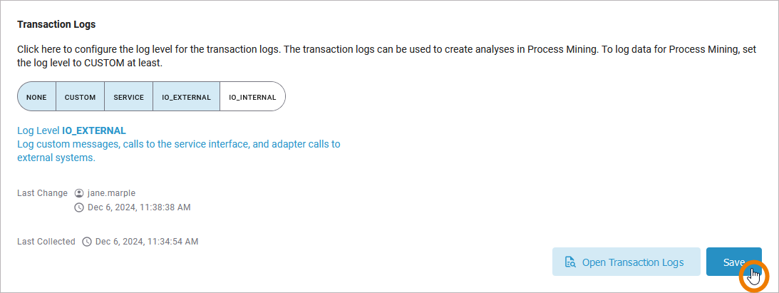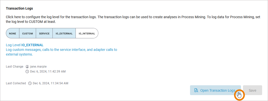 IOExternal | Logs custom messages, calls to the service interface, and adapter calls to external systems. | External systems, for example, are SAP, SQL, REST, etc. For SQL access, for instance, the queries sent to the database will be logged as well. Calls via the file system and system adapter are excluded. |