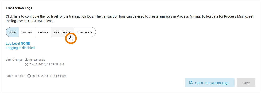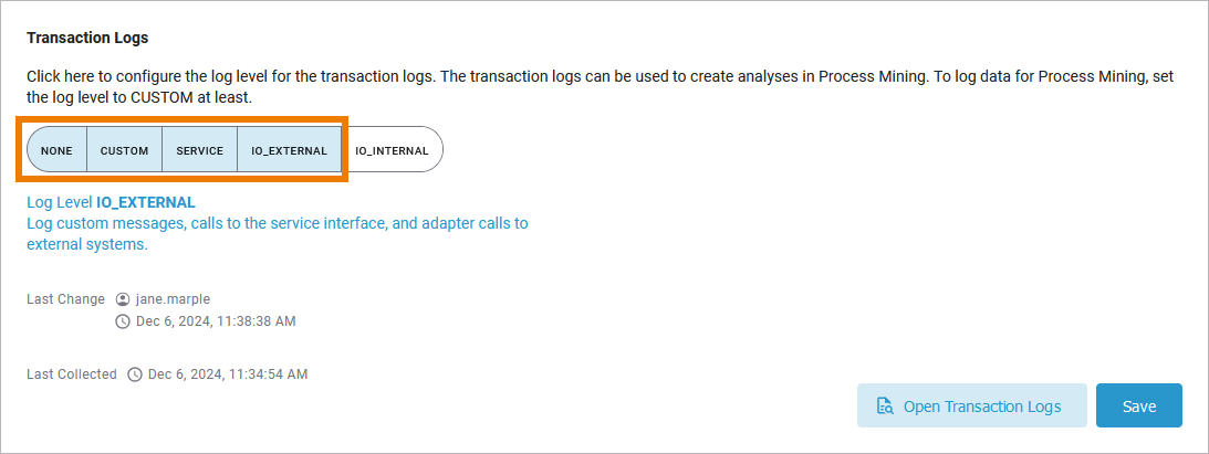 Since the log levels are cumulative, selecting IO_EXTERNAL also includes the log levels CUSTOM and SERVICE: