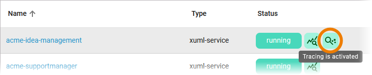 Users can see whether tracing is activated for a service in the Status column of the service list: