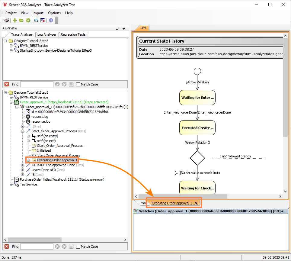 For xUML services running with trace enabled, the xUML Runtime collects tracing information and stores it to the service context. You can download this tracing data and you can browse through a graphical representation of the performed executions.